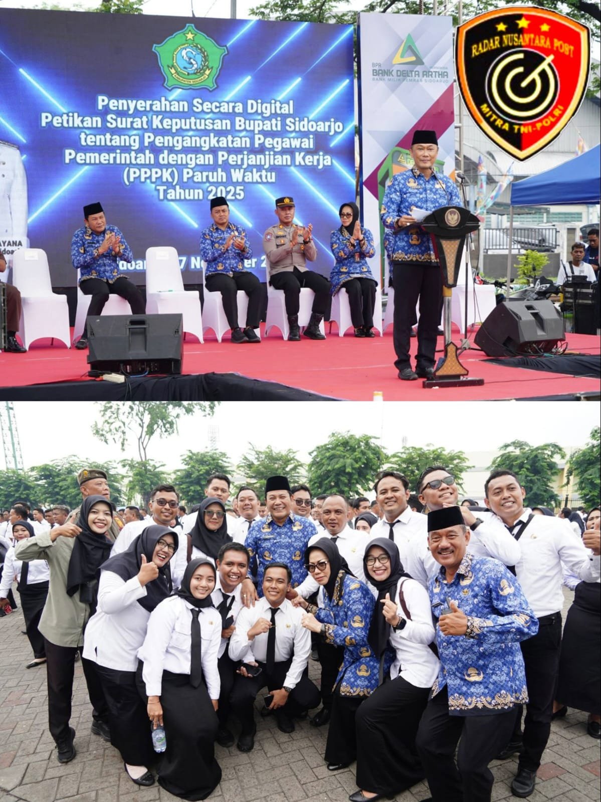 Ya, setalah lama mengabdi, akhirnya ujung penantian itu tiba. Meskipun langit tertutup awan pekat, mereka tetap semangat dan nampak khusyu mengikuti prosesi penyerahan SK PPPK Paruh Waktu secara digital oleh Bupati Sidoarjo Subandi dan ,Kepala BKN Republik Indonesia, Prof. Zudan Arif Fakrulloh, di Parkir Timur GOR Delta Sidoarjo, Senin (17/11/25).
