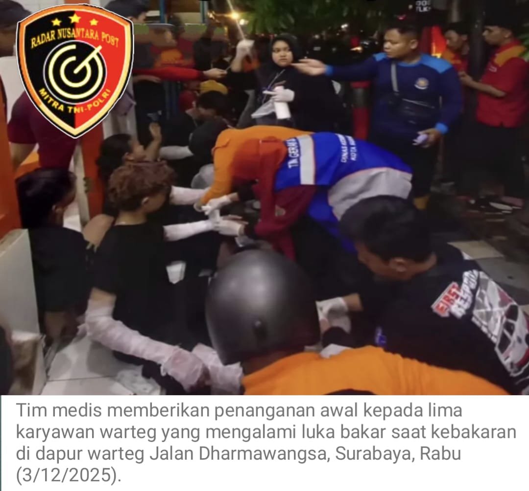๐ฆ๐จ๐ฅ๐๐๐๐ฌ๐,Radar Nusantara Postโ Sebuah warteg di Jalan Dharmawangsa Nomor 144 A, Gubeng, Surabaya, mengalami kebakaran pada Rabu (3/12/2025) malam. Peristiwa tersebut mengakibatkan lima orang pegawai rumah makan mengalami luka bakar.
