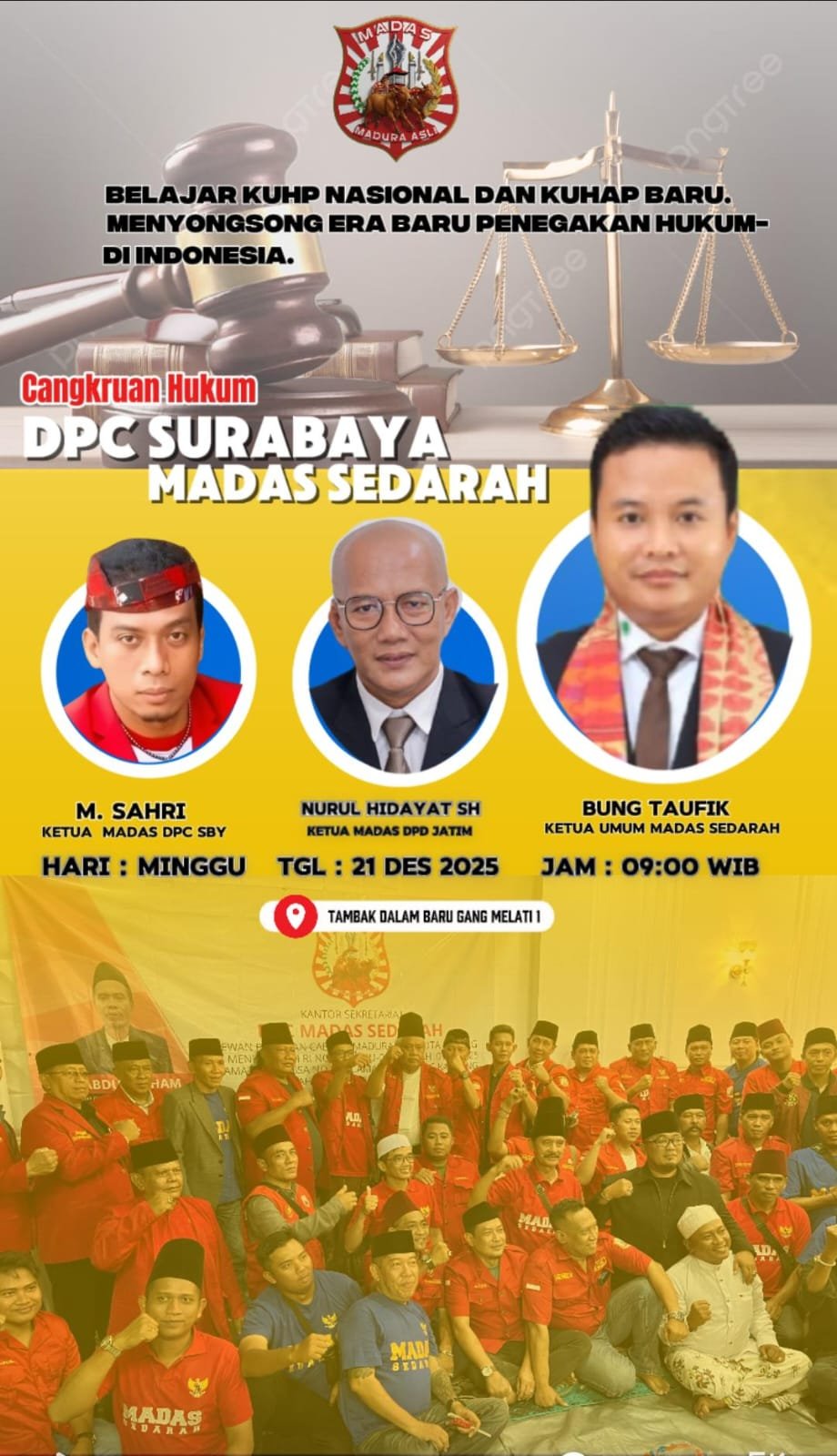 Dengan menyelenggarakan kegiatan Cangkruan Dasar Hukum bertema “ Belajar KUHP Baru dan KUHAP Nasional, Tantangan dalam Penegakan Hukum yang Berkeadilan” yang akan digelar pada Minggu, 21 November 2025, Pukul 09:00 Wib bertempat di Tambak Dalam Baru Gang Melati 1 Kota Surabaya.