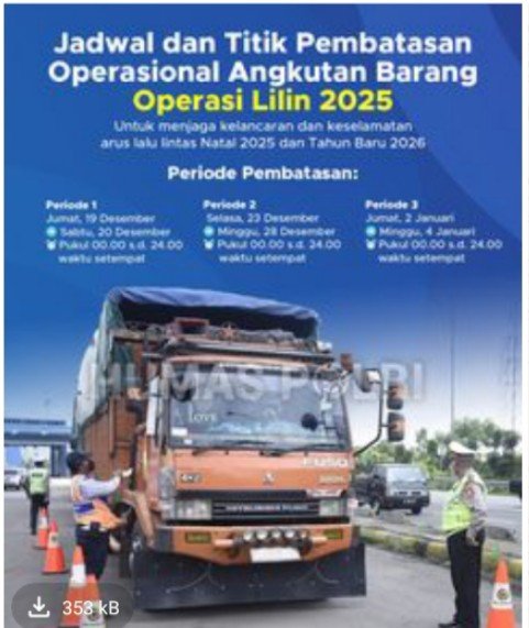 Pembatasan operasional angkutan barang akan berlaku mulai 24 Desember 2025 pukul 00.00 WIB hingga 1 Januari 2026 pukul 24.00 WIB, dengan beberapa pengecualian untuk angkutan barang yang mengangkut BBM/BBG, hantaran uang, hewan dan pakan ternak, pupuk, penanganan bencana alam, sepeda motor mudik dan balik gratis, serta barang pokok.
