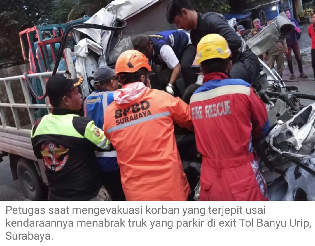 Berdasarkan keterangan Kabid Pemadaman DPKP Surabaya, Wasis Sutikno, petugas tiba di lokasi sekitar pukul 04.08 dan berhasil menyelesaikan proses evakuasi pukul 05.10. Diduga pengemudi dalam kondisi mengantuk sebelum akhirnya menabrak truk tronton yang terparkir di bahu kanan jalan.